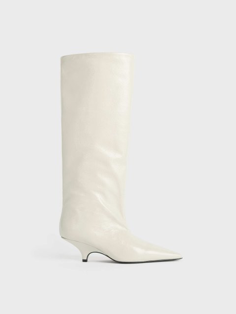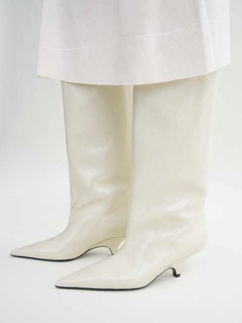Трендовый острый носок, удлиняющий силуэт, стал акцентом утонченных образов от Toteme. Ключевые модели: слингбеки на невысоком клиновидном каблуке и сапоги Wide Shaft на таком же каблуке.