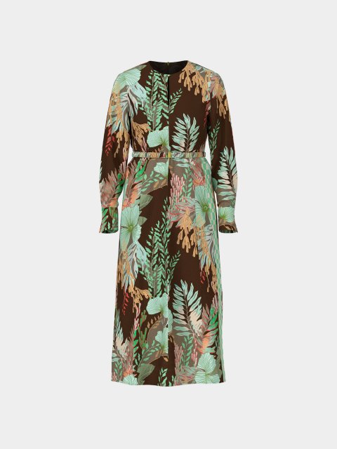 Похожий образ можно составить с платьем миди, которое сочетает полосатый узор и фирменный принт коллекции. Расслабленный силуэт дарит чувство свободы и уверенности, а легкая драпировка в зоне декольте и талии прекрасно подчеркивает фигуру.