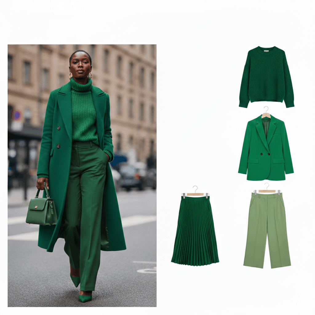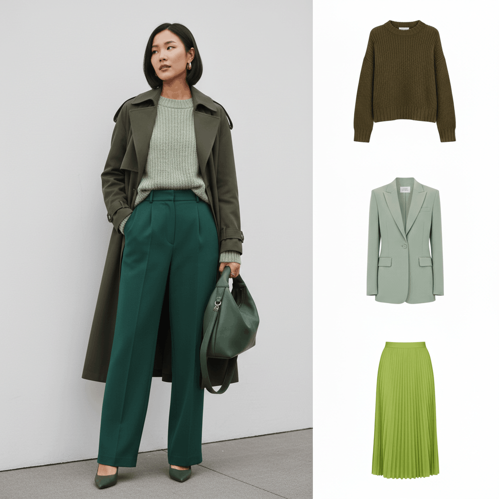 Они сочетаются с белым, графитом, тёмно-синим и тёплым жёлтым. В total look зелёные оттенки выглядят особенно выразительно при игре фактур. В 2026 году они входят в число самых популярных решений.