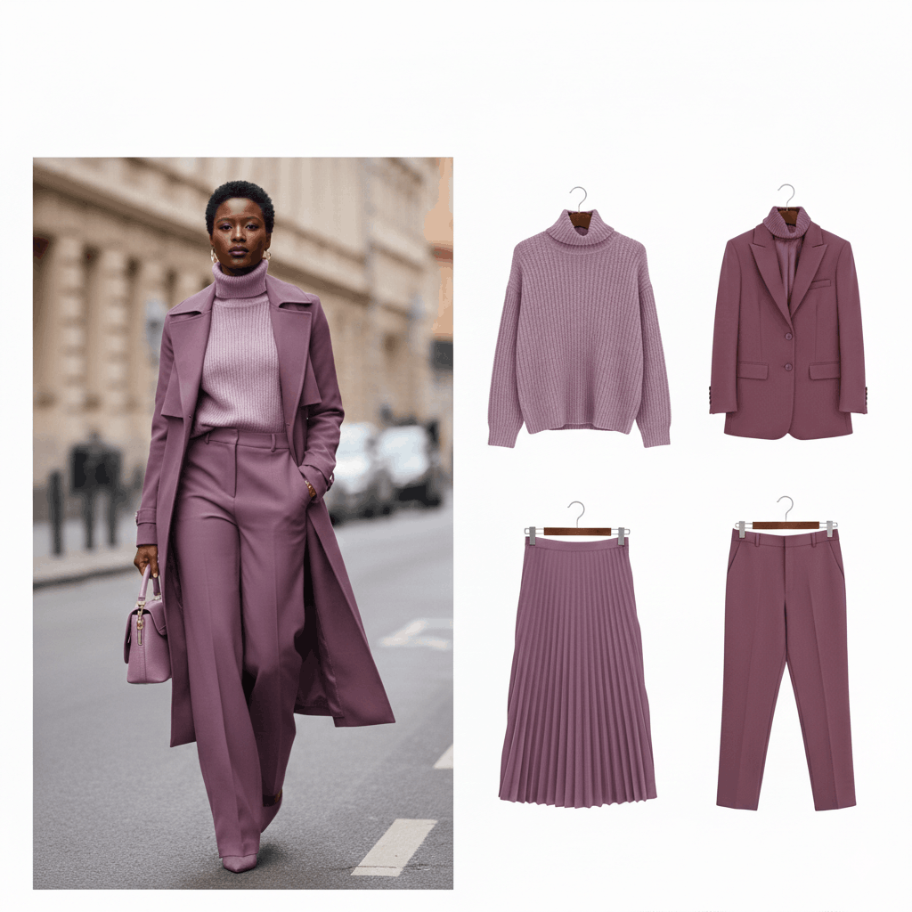 Эти цвета гармонично сочетаются с денимом, серым, молочным и тёмно-синим. В минималистичных образах лиловый заменяет привычные пастели. Подобные решения активно определяет цветовые ориентиры Pantone 2026, усиливая их популярность.