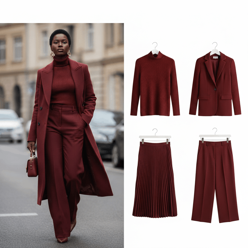 Винные оттенки сочетаются с тёмно-синим, серым и молочным. Такой образ выглядит собранно и выразительно, сохраняя баланс.