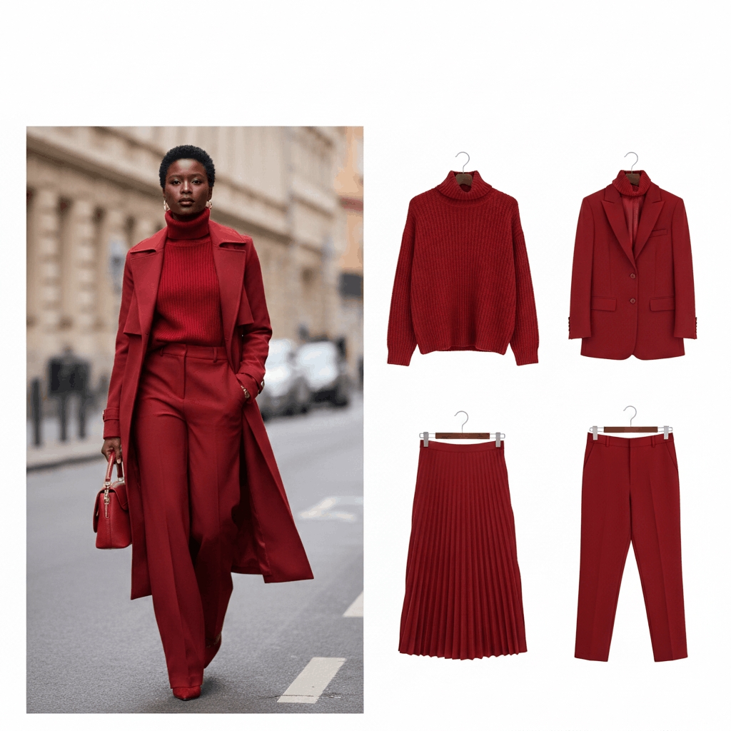 Такой красный сочетается с графитом, молочным, тёмно-синим и оливковым. В 2026 году он чаще работает как выразительный акцент, чем как доминирующий цвет. Это один из самых обсуждаемых трендовых цветов сезона.
