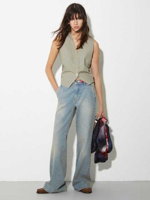 Палаццо: пара джинсов для элегантных образов. Сочетайте их с рубашками, топами с вырезами, кроп-жилетами и жакетами (особенно, если брюки имеют высокую посадку). В качестве обуви рекомендуем выбрать мюли, босоножки на танкетке или туфли на каблуке. Обратите внимание, что палаццо расклешенные в зоне лодыжки, поэтому, чтобы не перегрузить образ, не носите их с массивной обувью.