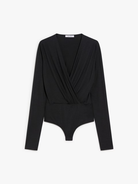 Классическое черное боди с неглубоким вырезом сочетайте с классическими брюками со стрелками или юбкой и туфлями-лодочками. В качестве аксессуаров используйте лаконичный ремень, офисную сумку, серьги и браслет или часы. Финальный штрих — собранные волосы.