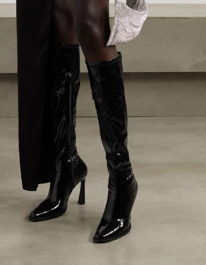 Лаковая кожа снова актуальна. Глянцевая поверхность придаёт обуви выразительность и подчеркивает форму. Такие сапоги можно носить с минималистичными платьями, брюками или пальто, чтобы добавить образу немного блеска.