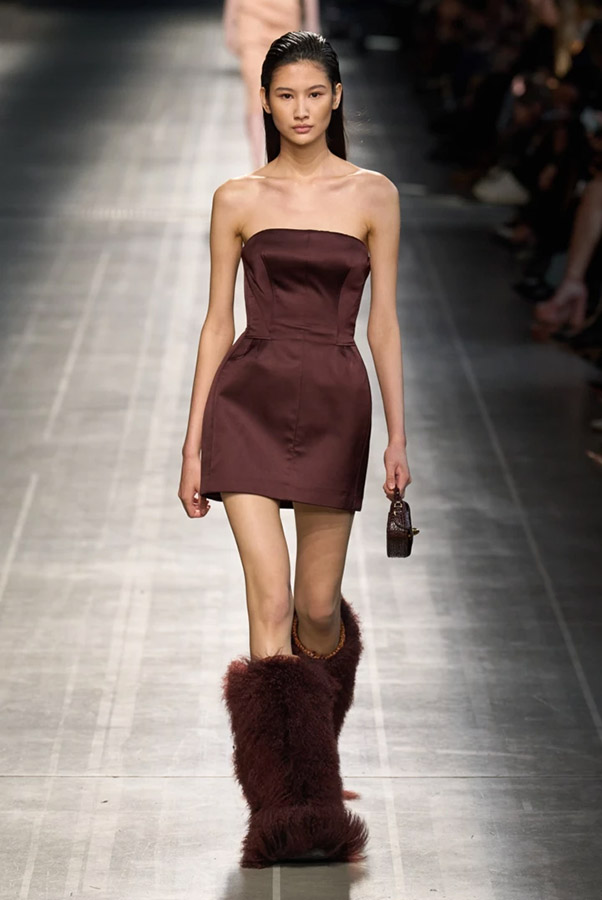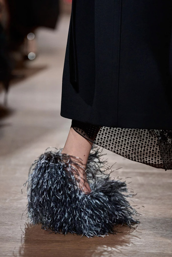 Пушистые текстуры используются не только для изготовления шарфов. В этом году мех украшает обувь. Тренды обуви «зима 2024» открыли несколько неожиданную комбинацию: ботинки, туфли, босоножки, сапоги украшенные пушистым мехом. Самые яркие примеры представлены на подиумах Ermanno Scervino, Jil Sander и Ferragamo.