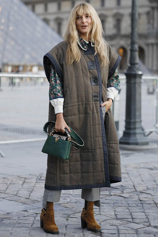 ● наденьте джинсы, рубашку, джемпер, наверх жилет или пальто; завершите образ стильной сумочкой и сапогами;