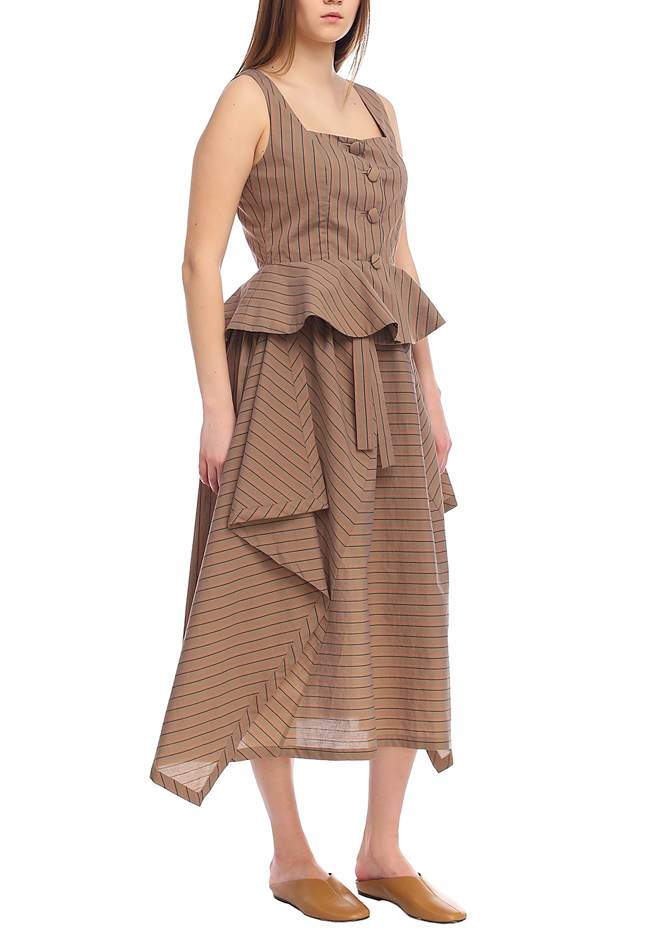 Детали: крой по фигуре, прямоугольная линия декольте, планка с рядом пуговиц, баска. Принт в полоску.