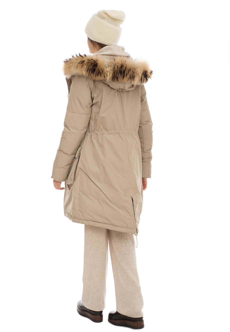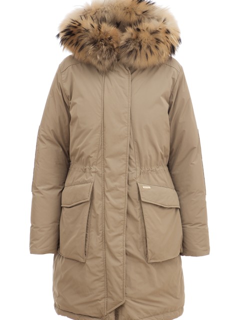Детали: традиционный крой, ворот стойка с большим утепленным капюшоном, накладные карманы с клапаном по бокам, кулиска с внутренней затяжкой по линии талии и по нижнему краю, шлица на спинке. Наружный материал непродуваемый, водоотталкивающий, с эффектом «shape memory” при снятии возвращается в исходную форму, утеплитель – утиный пух/перо (90/10%), оторочка из меха по капюшону и внутреннему краю вдоль застёжки. Застёгивается молнией с двумя бегунками и клапаном с кнопками.