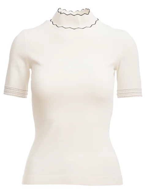 Детали: облегающий крой, короткий втачной рукав, высокий ворот с контрастным воинством кантом.