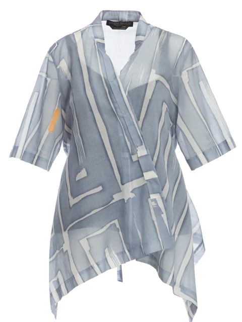 Детали: крой-кимоно на запах, короткий втачной рукав, пояс на спинке, геометрический принт.