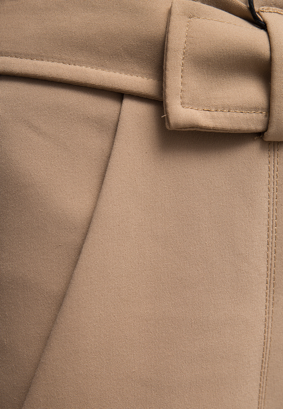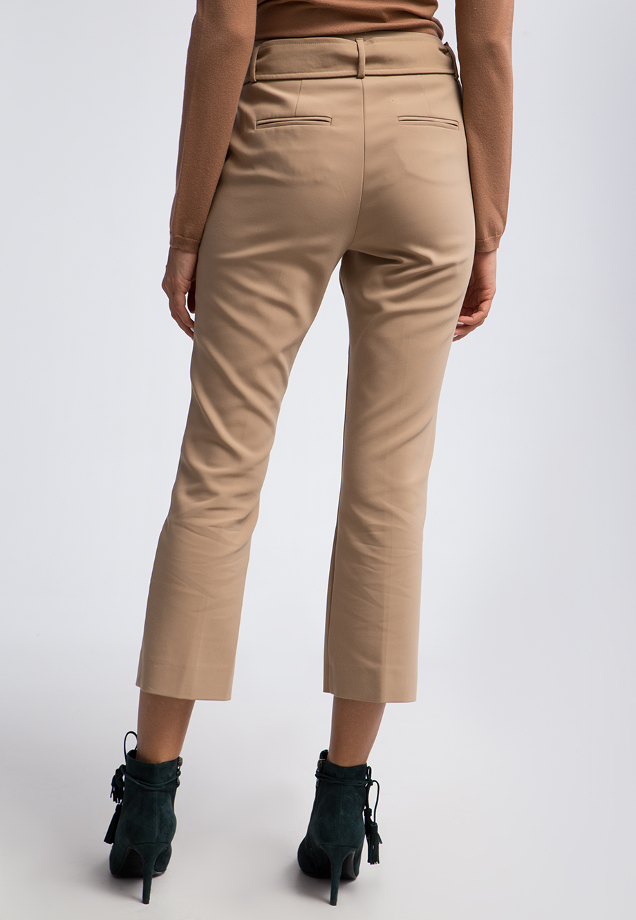 Детали: прямой крой, высокая посадка, французские боковые карманы, сзади два прорезных с рантом, пояс со шлевками для ремня, ремень с пряжкой, длина ⅞.
