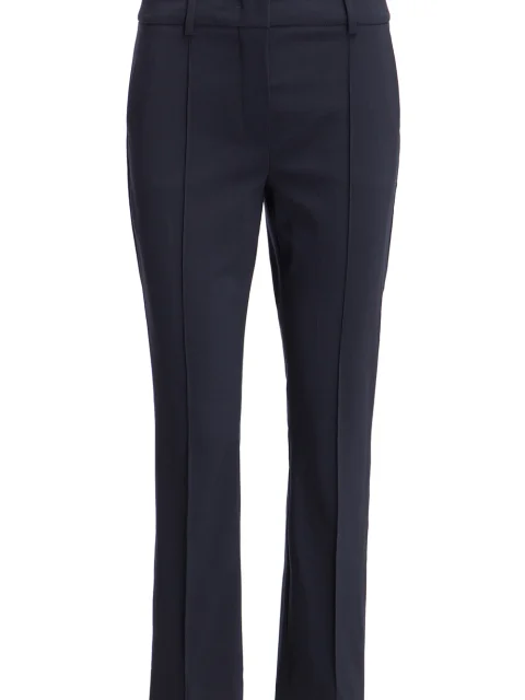 Детали: прямой крой, средняя посадка, французские боковые карманы, два прорезных с рантом сзади, прошитые стрелки вдоль штанин, потайные молнии по боковым швам.