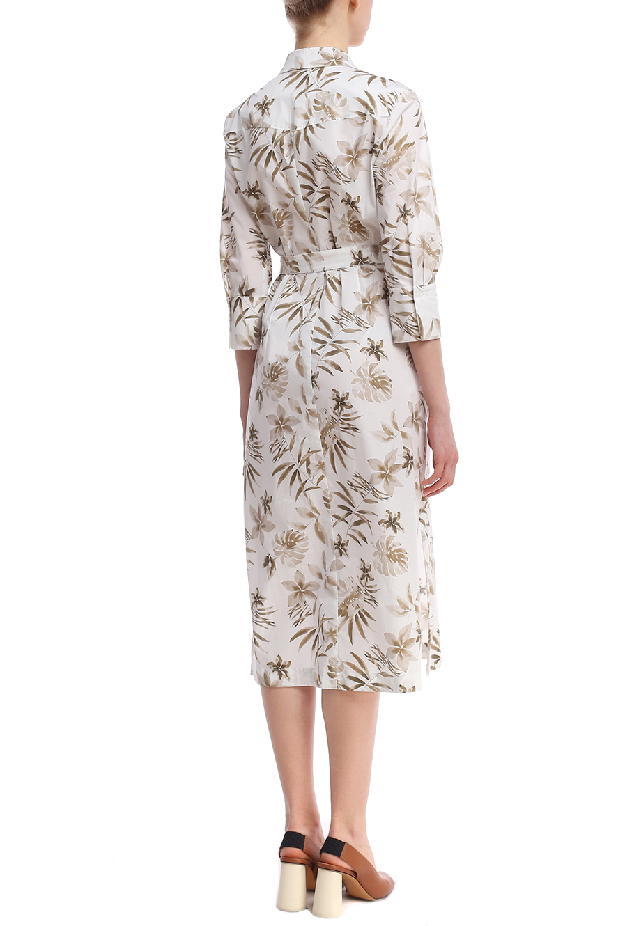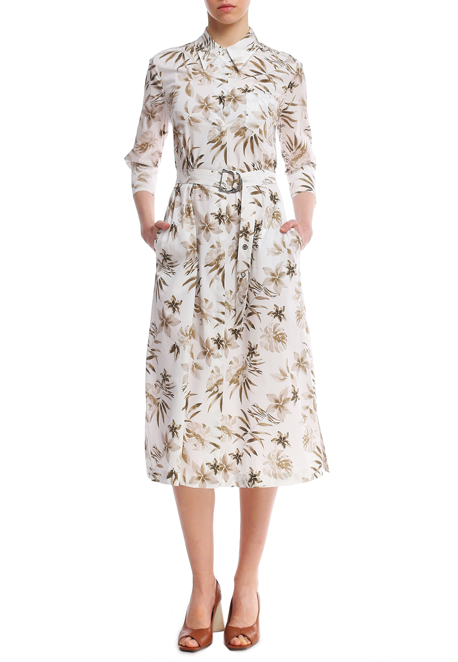 Детали: прямой крой под пояс, отложной воротник, втачной рукав длиной ¾ с манжетами на пуговице, прорезные карманы по боковым швам, планка с рядом пуговиц, пояс с затяжными пряжками, длина миди.