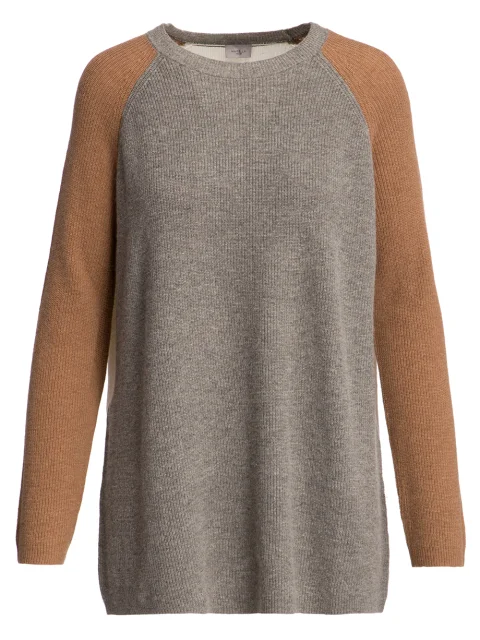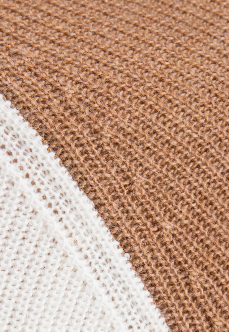 Детали: прямой удлинённый крой, длинный рукав реглан контрастного песочного цвета, спинка - молочного. Рельефная вязка резинкой.