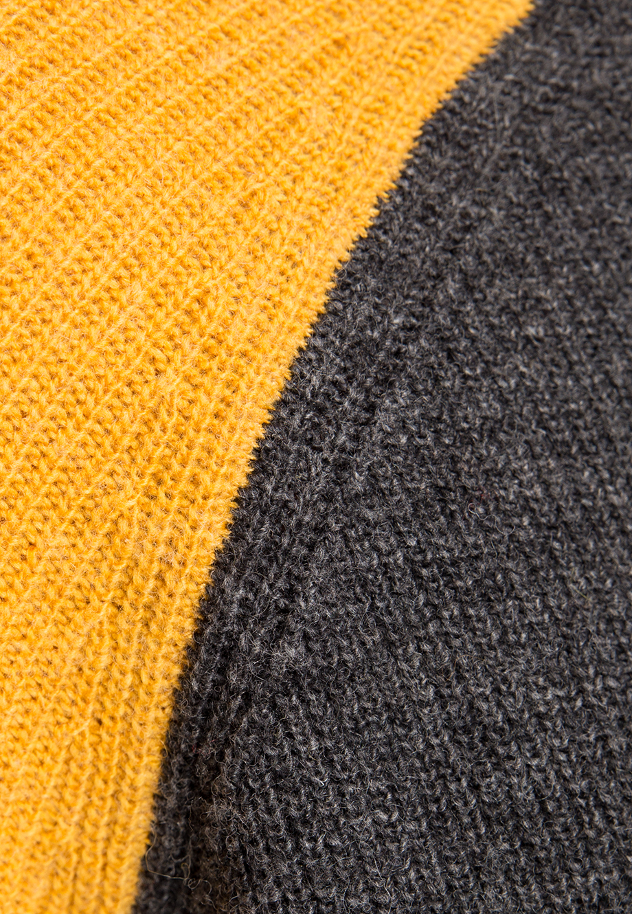 Детали: прямой удлинённый крой, длинный рукав реглан контрастного жёлтого цвета, спинка - светло-серого. Рельефная вязка резинкой.