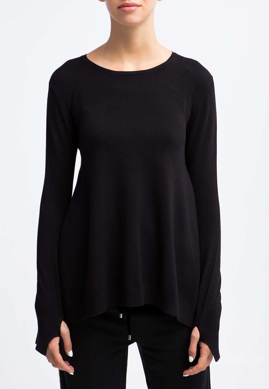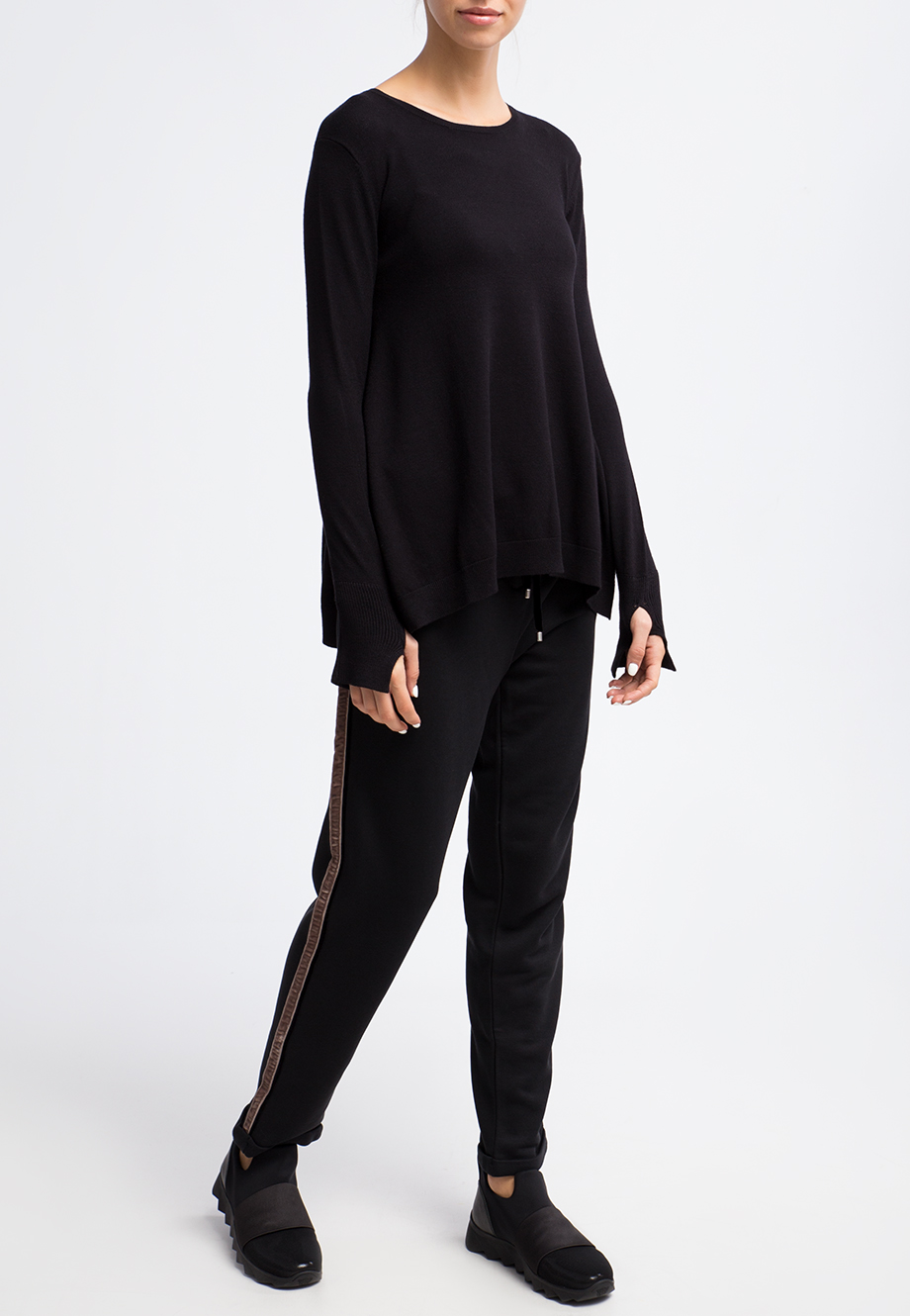 Детали: А-силуэт, круглый вырез горловины, длинный втачной рукав, боковые разрезы, резинки по нижнему краю и на рукавах.