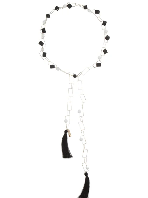 Детали: цепочка из металлических прямоугольных звеньев, с черно-белыми бусинами и шелковыми кистями на концах.