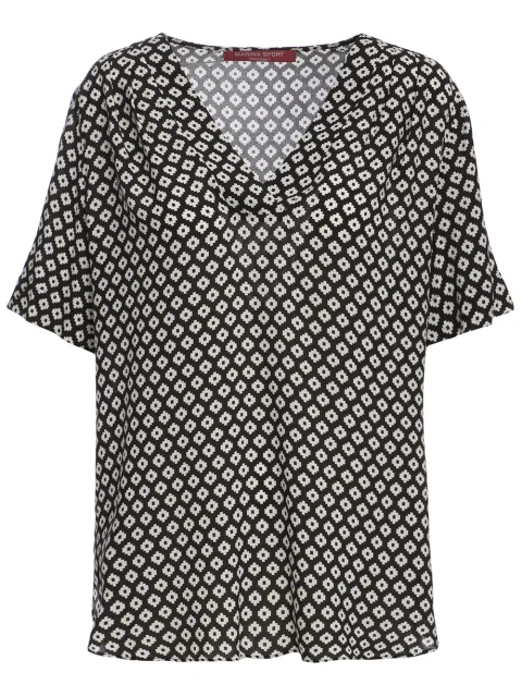 Детали: прямой крой, V-образная форма декольте, короткий втачной рукав, удлинённая спинка, закруглённый нижний край, монохромный принт.