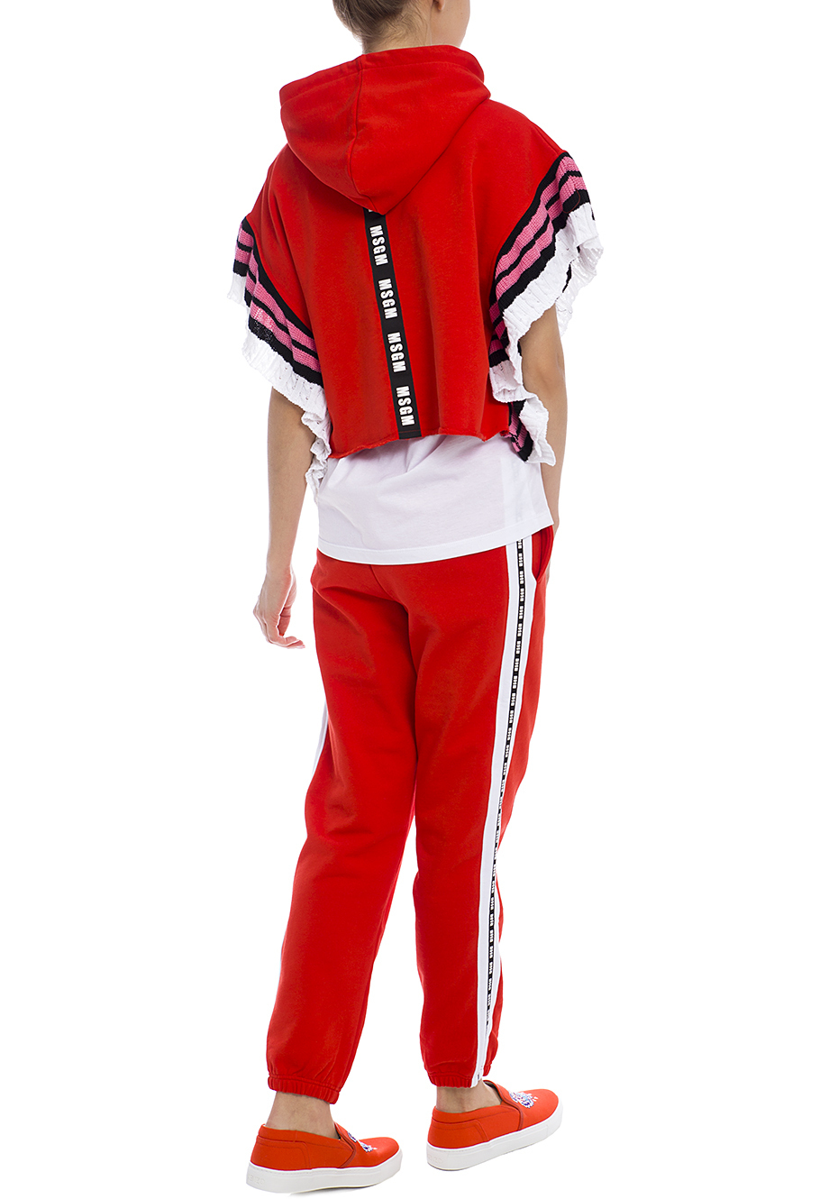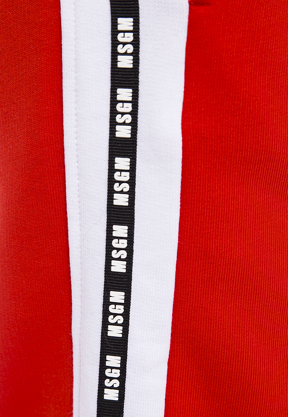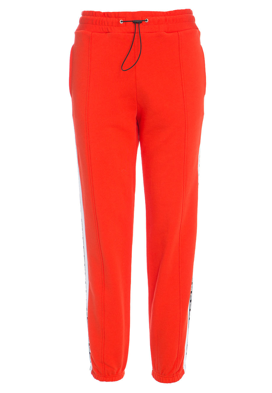 Детали: прямой крой, высокая посадка, прорезные карманы по боковым швам, пояс с резинкой и кулиской, простроченные стрелки вдоль штанин, по боковым швам лампасы с логотипом. По нижнему краю резинка.