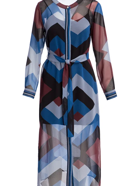 Детали: прямой крой, круглый вырез горловины, планка, длинный втачной рукав с манжетой на пуговице, боковые разрезы, пояс по линии талии, подклада-комбинация, абстрактный принт.