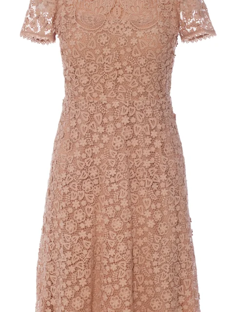 Детали: облегающий силуэт расклешенный от пояса, отрезная линия талии, короткий рукав, отложной воротник с закруглёнными краями, фигурный край подолаи рукавов, длина до колена, застегивается потайной молнией на спинке. Подклада в тон кружева.
