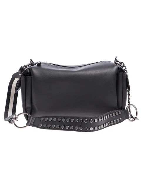 Детали: прямоугольная объёмная форма, съёмный плечевой ремень из стропы на карабинах, второй декорирован клёпками, симметричные боковые карманы с клапанами, отделение на молнии.
