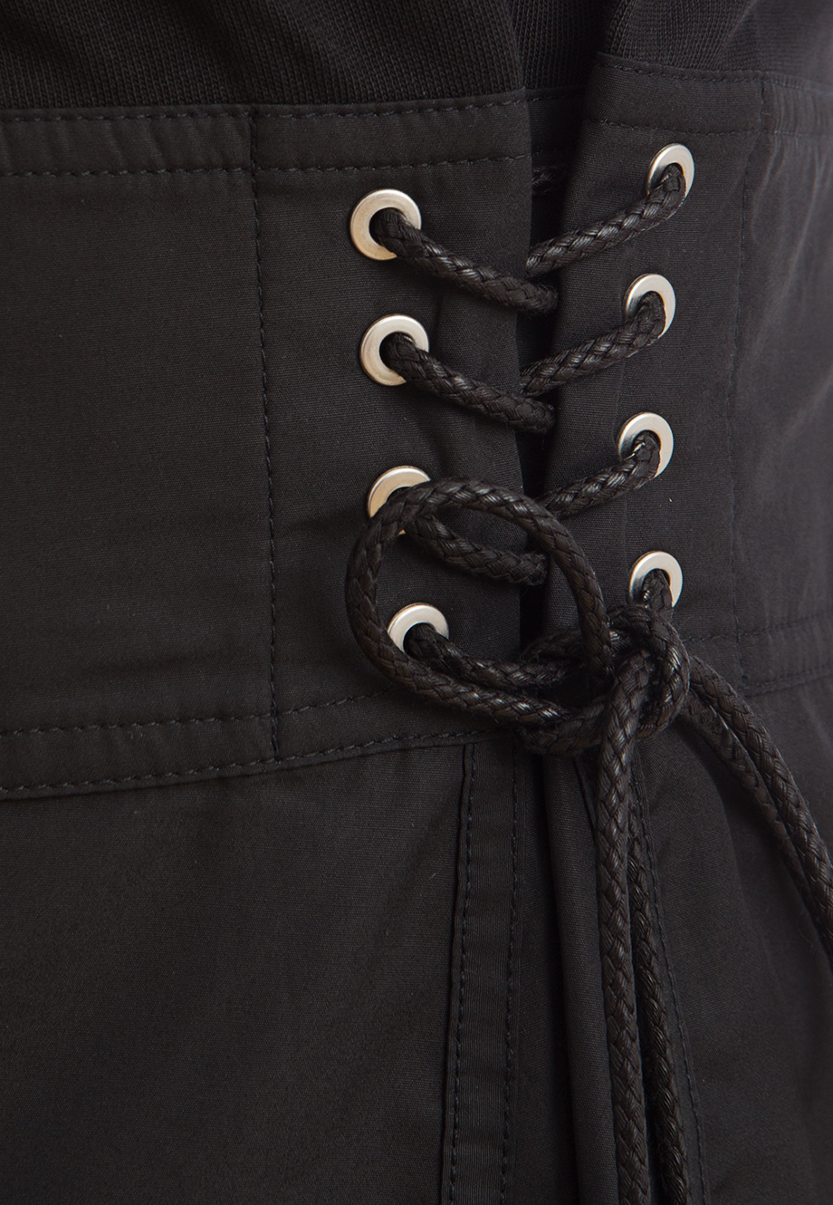 Детали: прямой крой, круглый вырез горловины, цельнокройный короткий рукав с отворотом, по линии твоим вшитый пояс со шнуровкой.