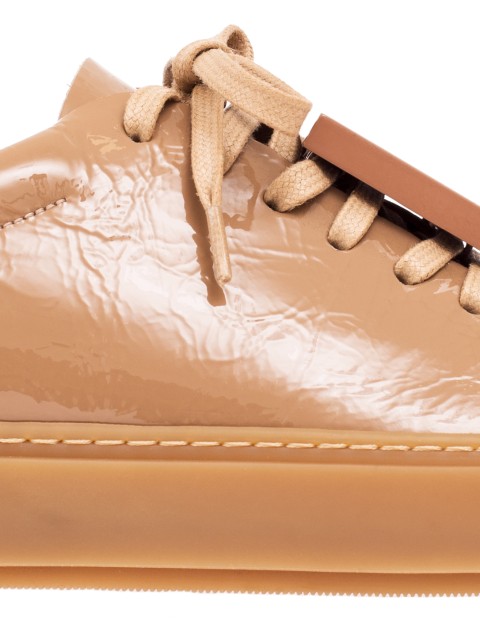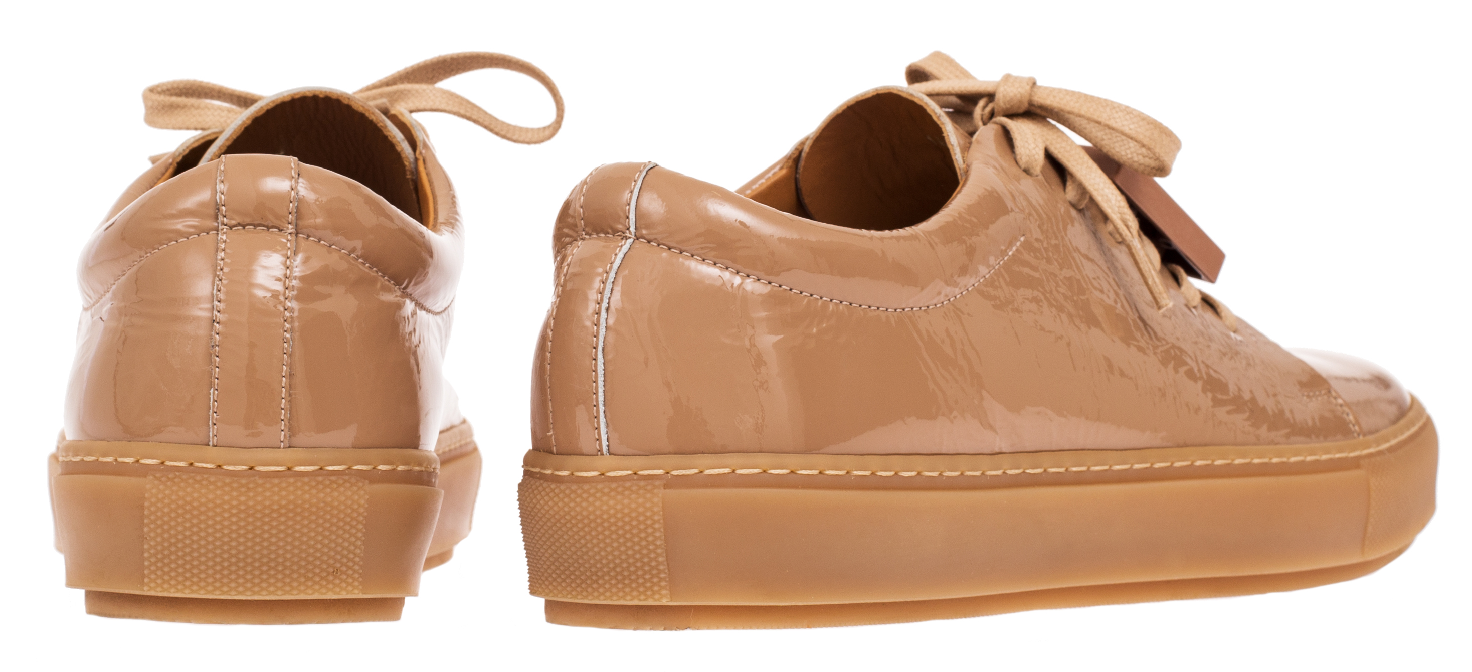 Детали: мягкая лаковая кожа, закруглённый носок, прямая резиновая подошва высотой 2 см с прошивкой, на шнуровке закреплены пластиковые пластины с изображением смайлов, внутренняя отделка из кожи.