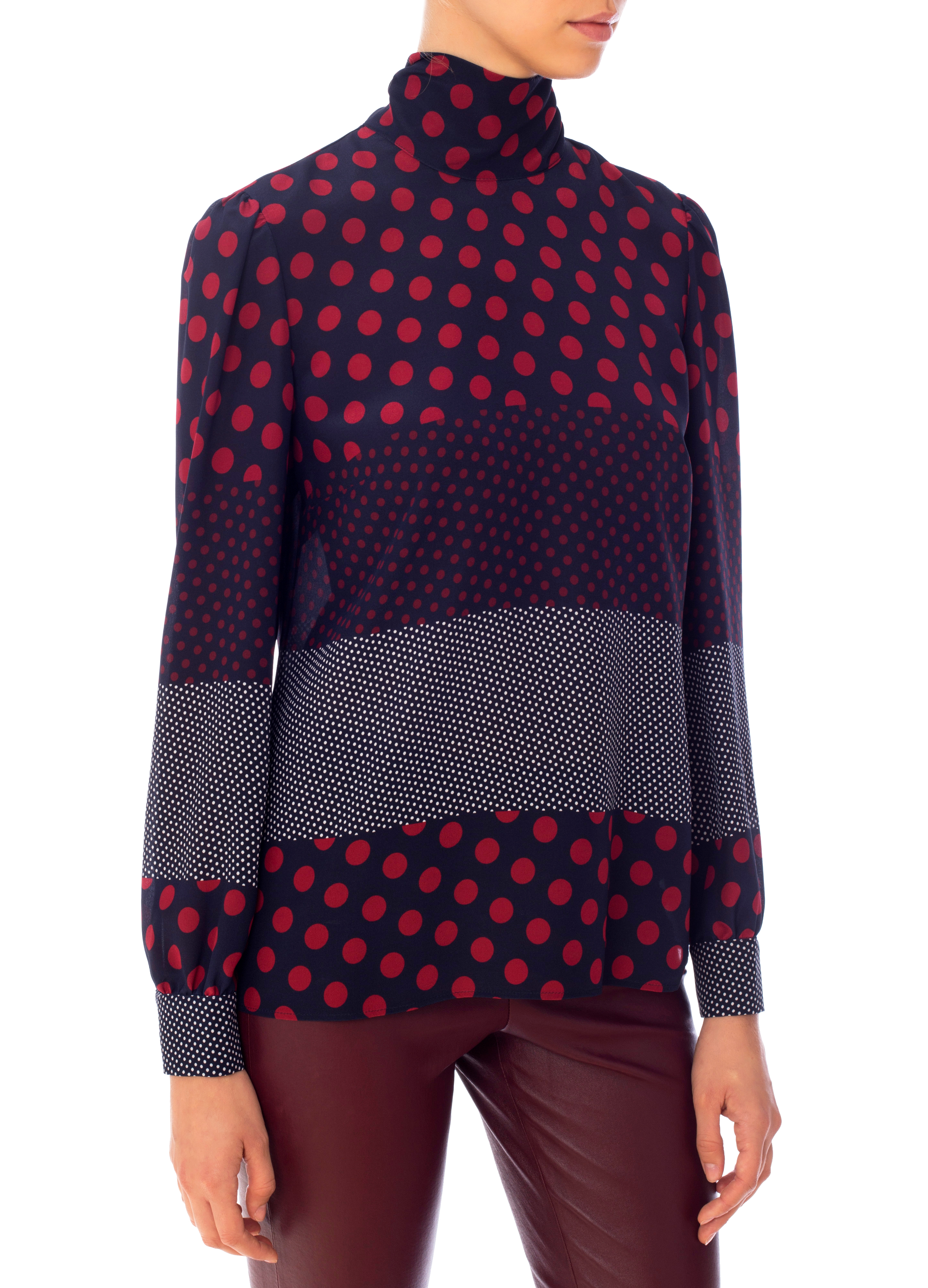 Детали: свободный прямой крой, длинный свободный рукав собранный широким манжетом, высший ворот стойка, переходящий в ленты, завязывающиеся на спинке. Три разных вида принта в горох расположены горизонтально.