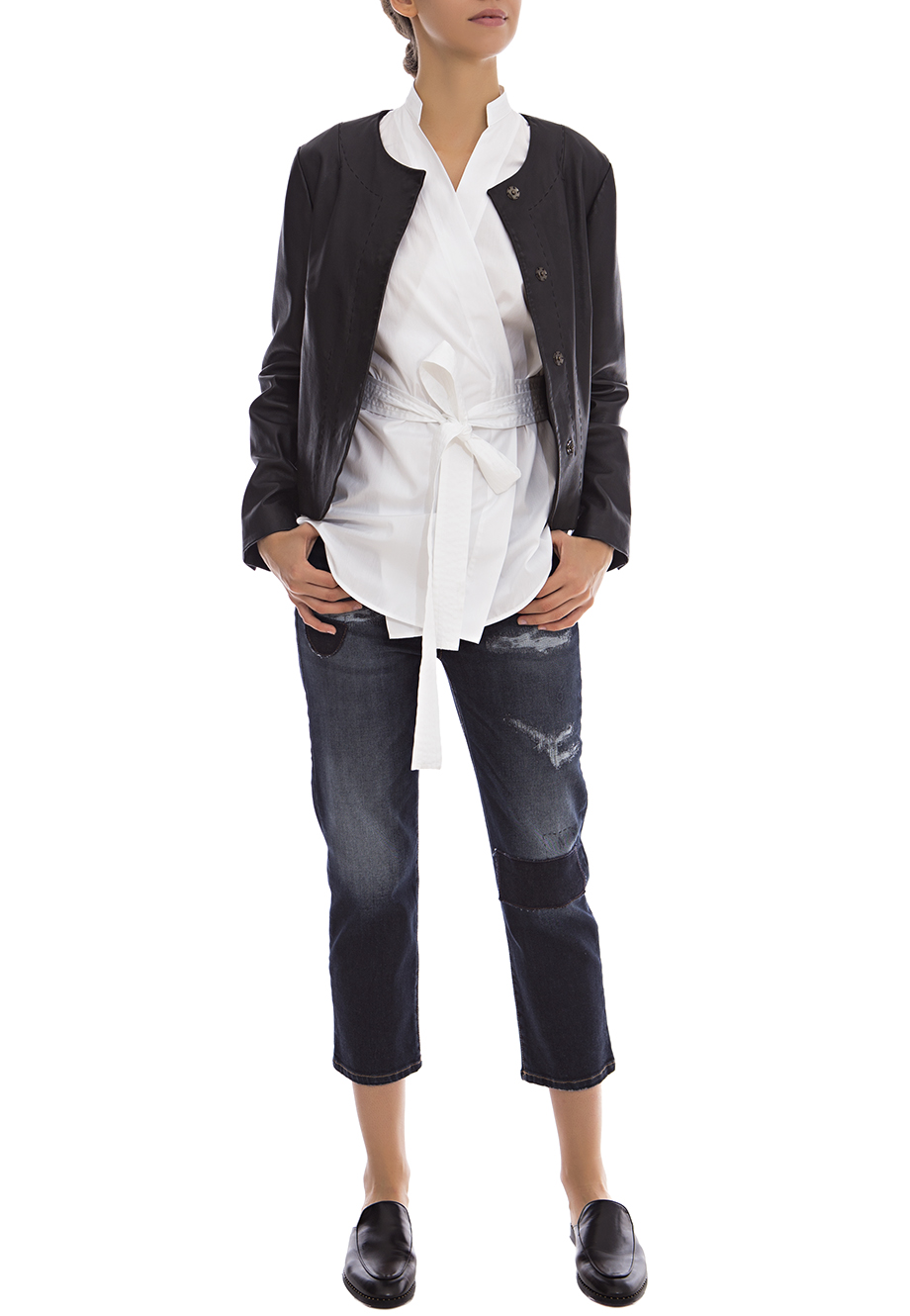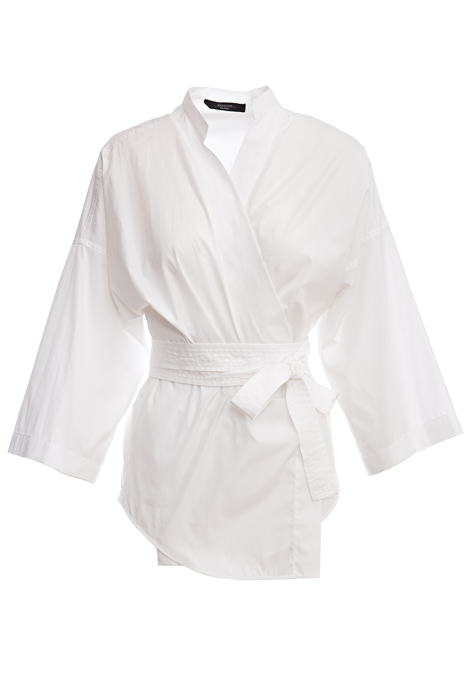 Детали: традиционный крой на запах, спущенный укороченный рукав, ворот стойка, закругленный нижний край. Фиксируется поясом по линии талии.