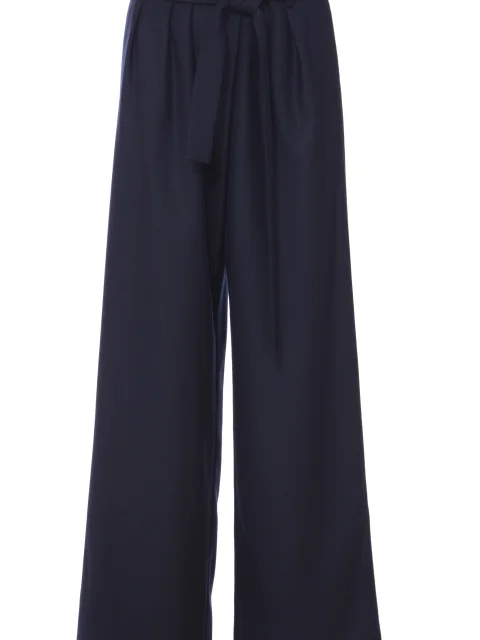 Детали: прямой струящийся крой от бедра, высокая посадка, кромка пояса с оборками, прорезные карманы по боковым швам, ширинка, потайной крючок, шлевки для ремня. Дополнительный тканевый пояс.