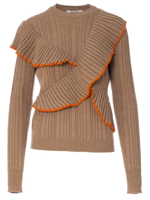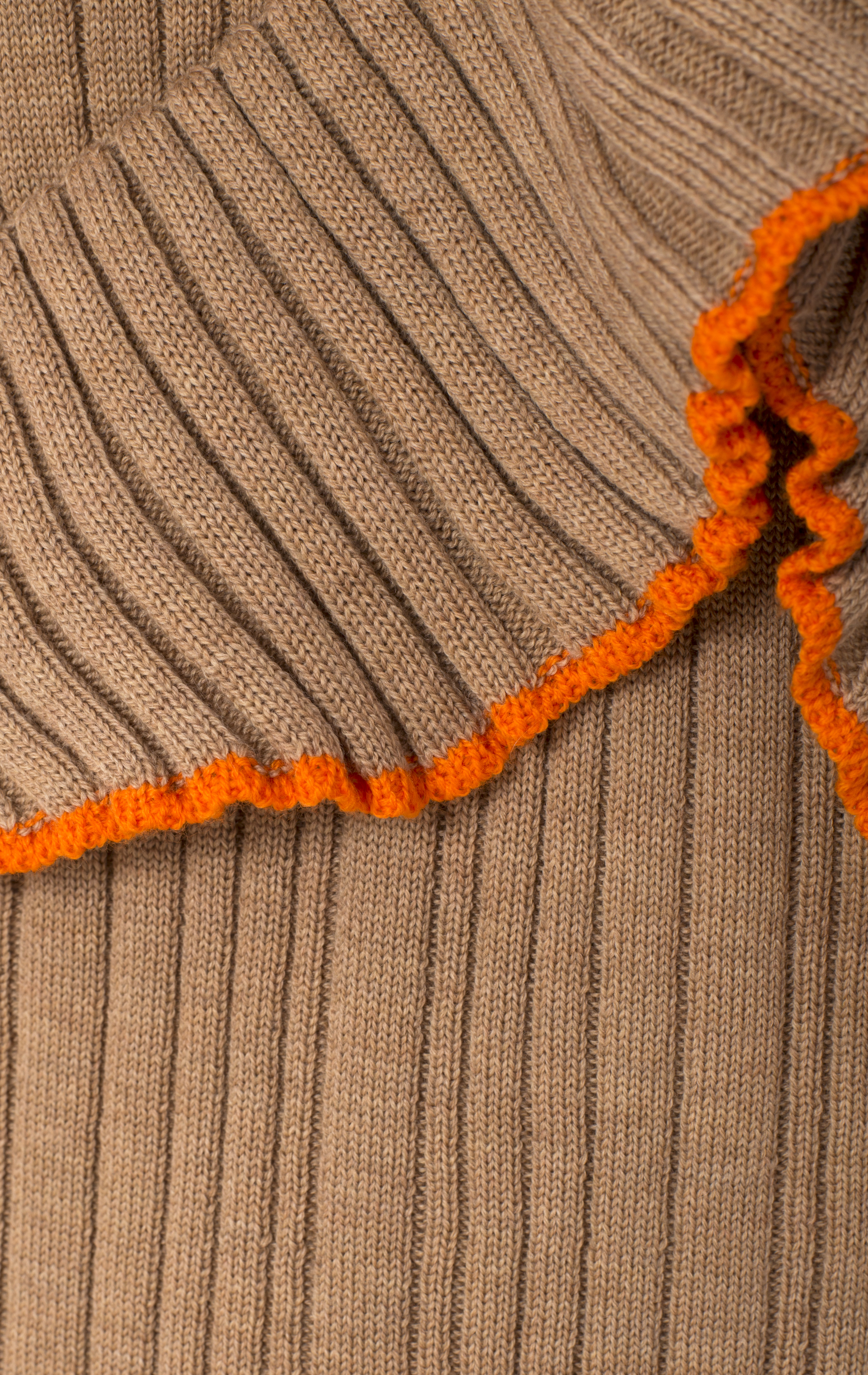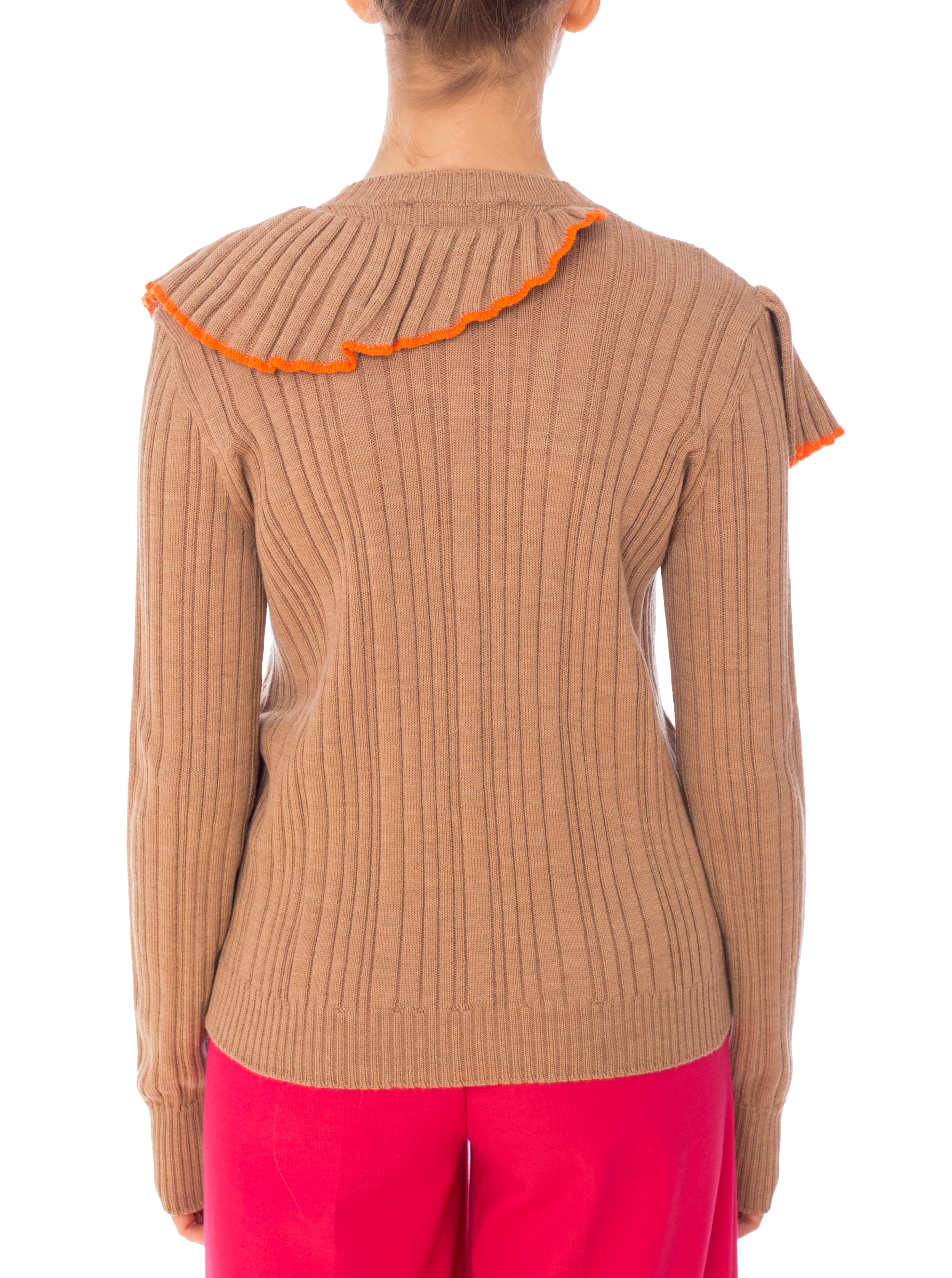 Детали: облегающий силуэт, круглый вырез горловины,фактурная вязка, удлиненный рукав, оборки с оранжевой окантовкой на груди и вокруг горловины.