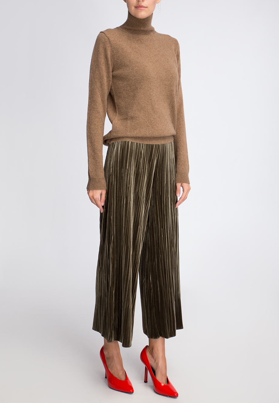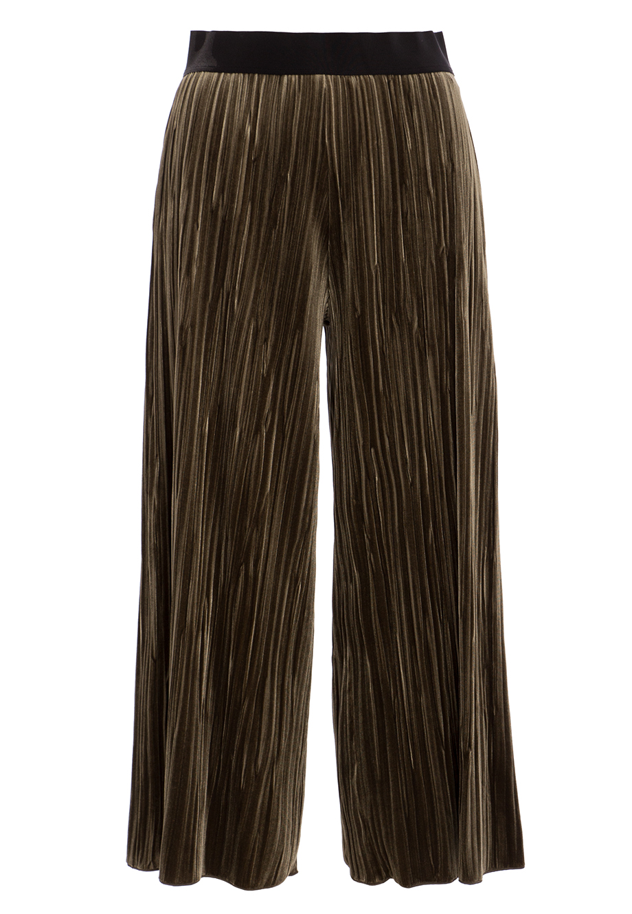 Детали: прямой свободный от бедра крой, высокая посадка, эластичный контрастный пояс, мелкая плиссировка.