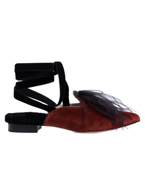 Детали: заострённый носок, цветная замша, каблук высотой 2 см, меховая стелька, декор перьями, бархатные завязки.