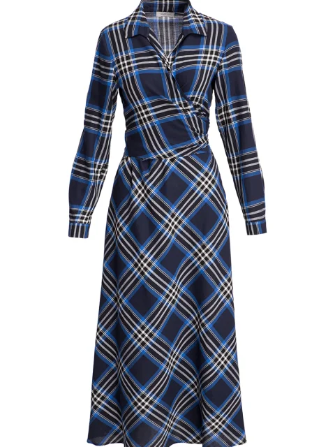 Детали: А-силуэт, крой на запах, отложной воротник, длинный втачной рукав с манжетой на пуговице, широкий пояс по линии талии, длина миди, клетка «тартан».