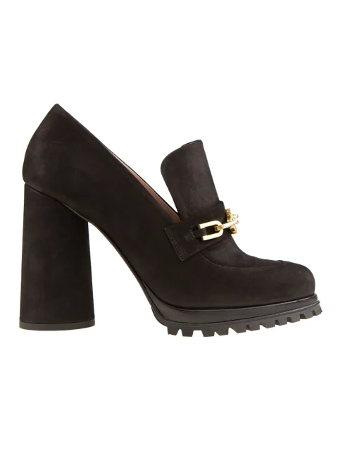 Детали: квадратный носок, перестрочка, высокая союзка с металлической цепью, подошва с протектором, устойчивый каблук с отделкой из замши (10 см).