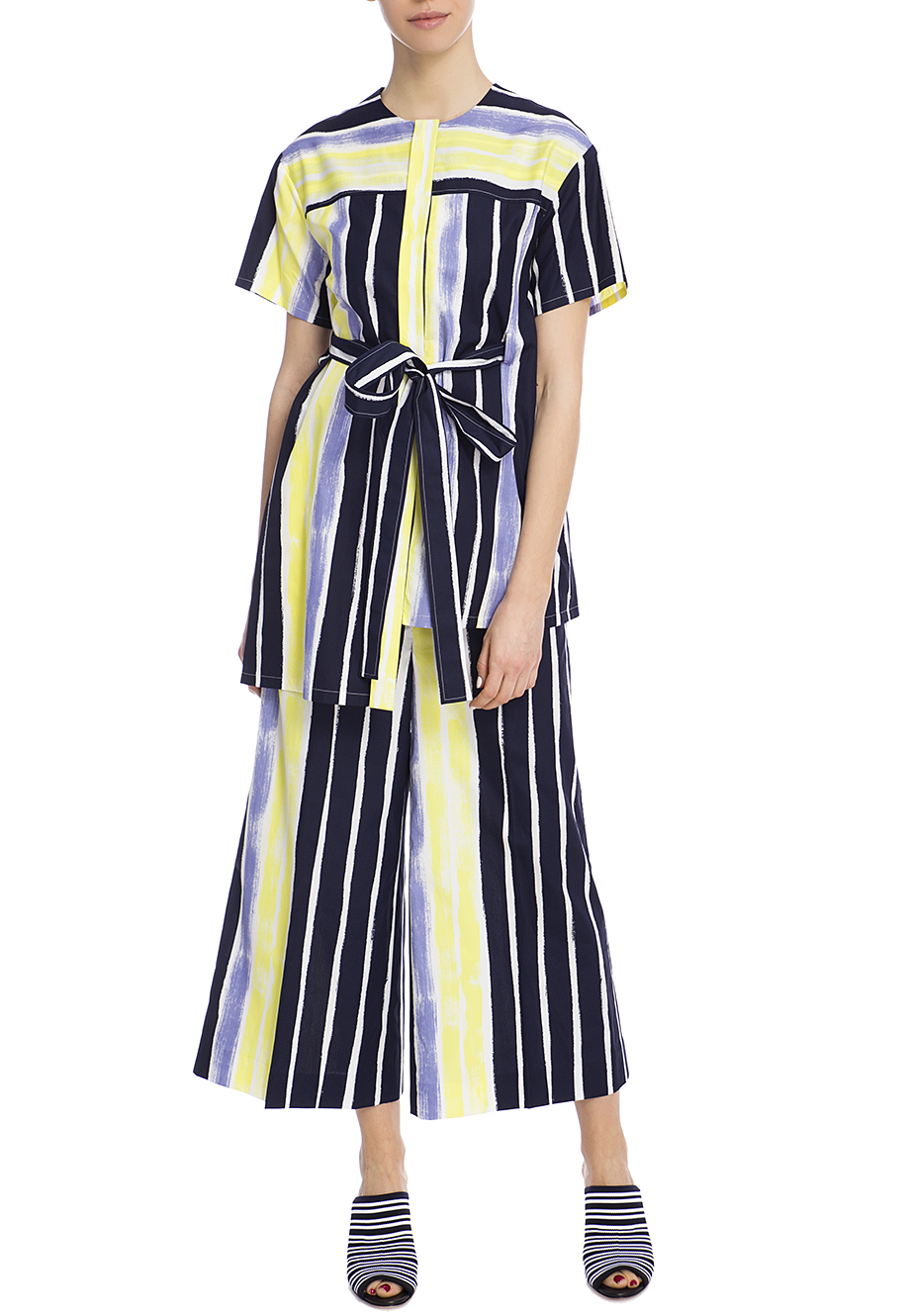 Детали: прямой свободный от бедра крой, высокая посадка, французские боковые карманы, сзади два прорезных с рантом, принт в акварельную полоску.