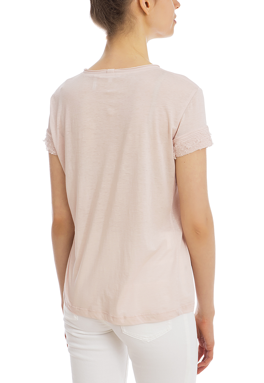 Детали: прямой крой, круглый вырез горловины, короткий втачной рукав, декорирован по краю оторочкой из аналогичного материала.