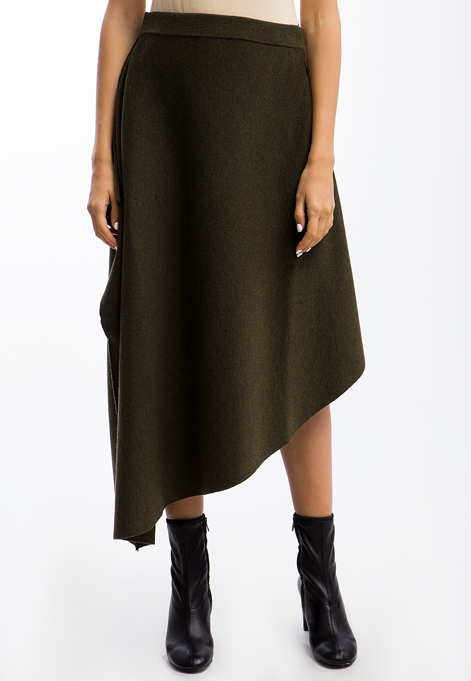 Детали: А-силуэт, высокая посадка, эластичный пояс, асимметричный подол, боковой разрез, диагональный крой.