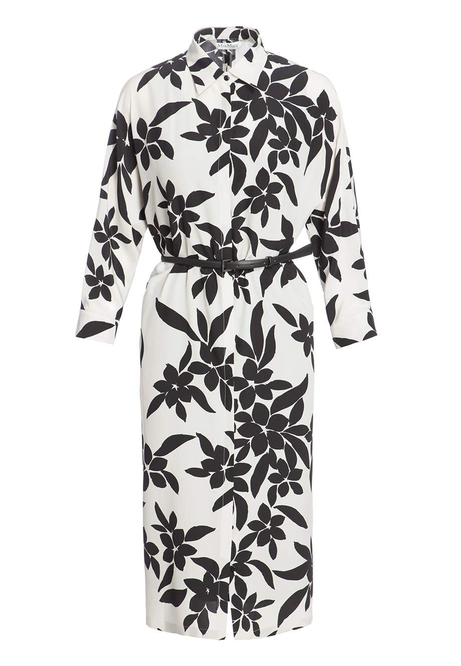 Детали: прямой крой, отложной воротник с планкой и скрытыми пуговицами, цельнокроеный рукав с манжетой на пуговице длиной 7/8, кожаный пояс по линии талии, длина миди.
