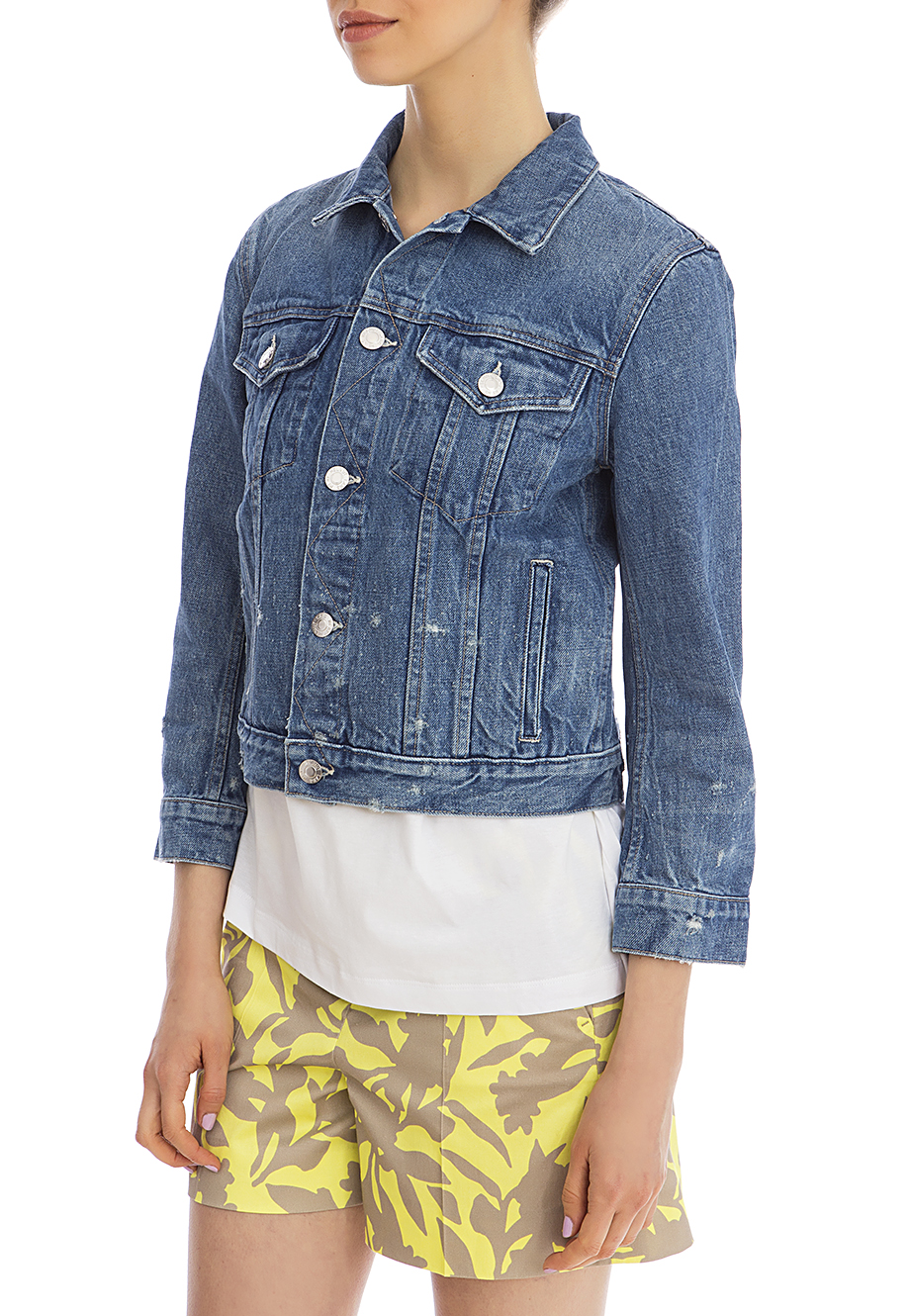 Детали: традиционный укороченный крой, отложной воротник, нагрудные карманы с клапаном и пуговицей, прорезные карманы по бокам, хлястики с пуговицами, регулирующие объем на нижней манжете укороченный втачной рукав с манжетой на пуговице. Мелкие прорехи, застегивается планкой с пуговицами.