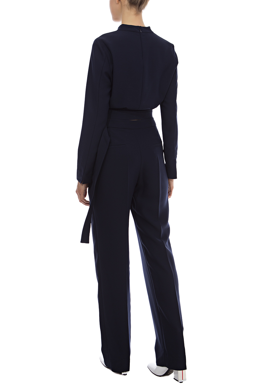 Детали: прямой свободный от бедра крой, высокая посадка, французские боковые карманы, сзади два прорезных с рантом. Пояс с двумя затяжными пряжками сбоку, потайная молния.