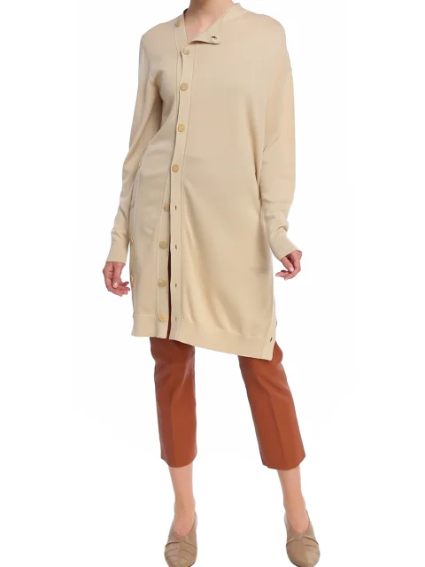 Овальный удлинённый крой, длинный втачной рукав, боковые разрезы с пуговицами, асимметричная планка с рядом пуговиц, манжеты по нижнему краю и на рукавах.