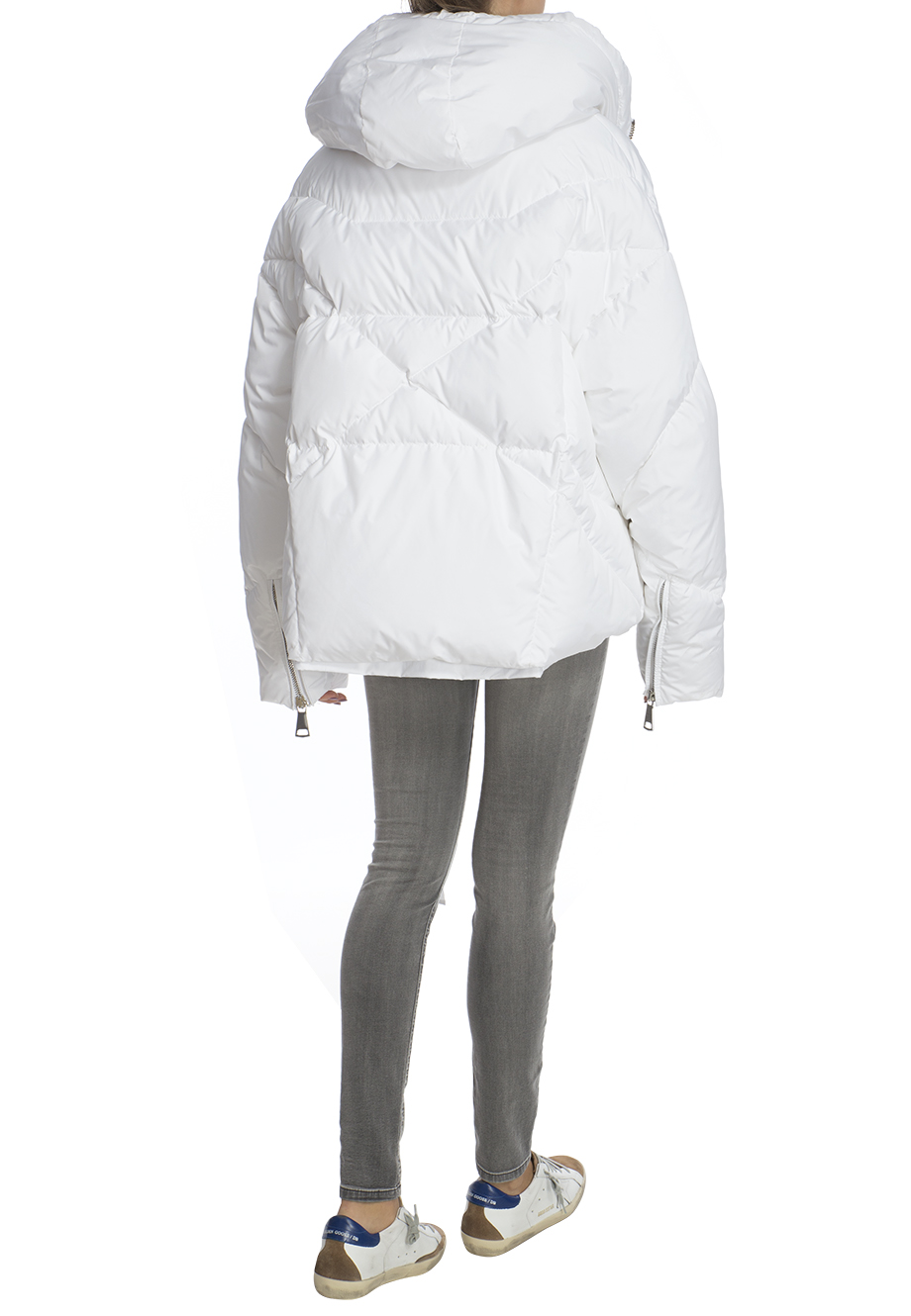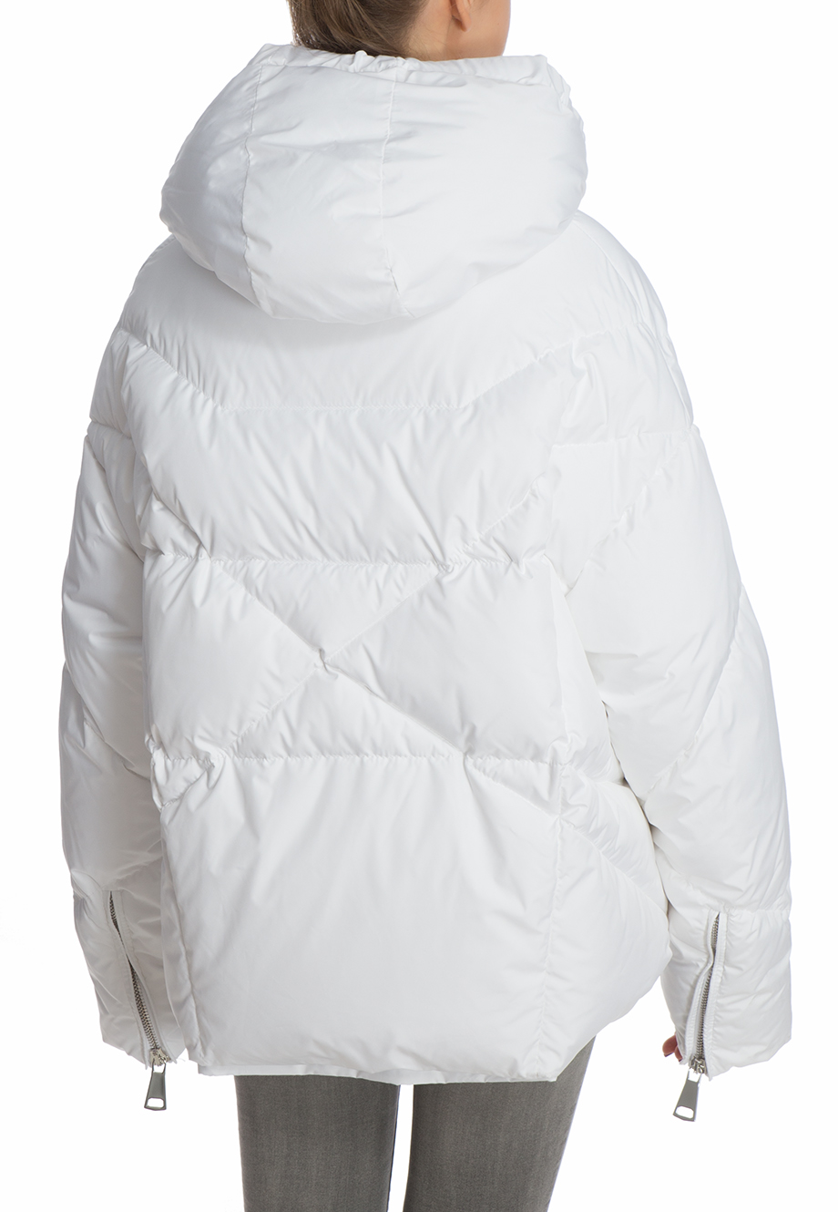 Детали: крой oversized, ворот с капюшоном, спущенный длинный рукав с молниями, фигурная стёжка, прорезные карманы с рантом по бокам, металлическая молния, декоративные шнурки в капюшоне и кулиске по нижнему краю. Утеплитель: пух 100%.