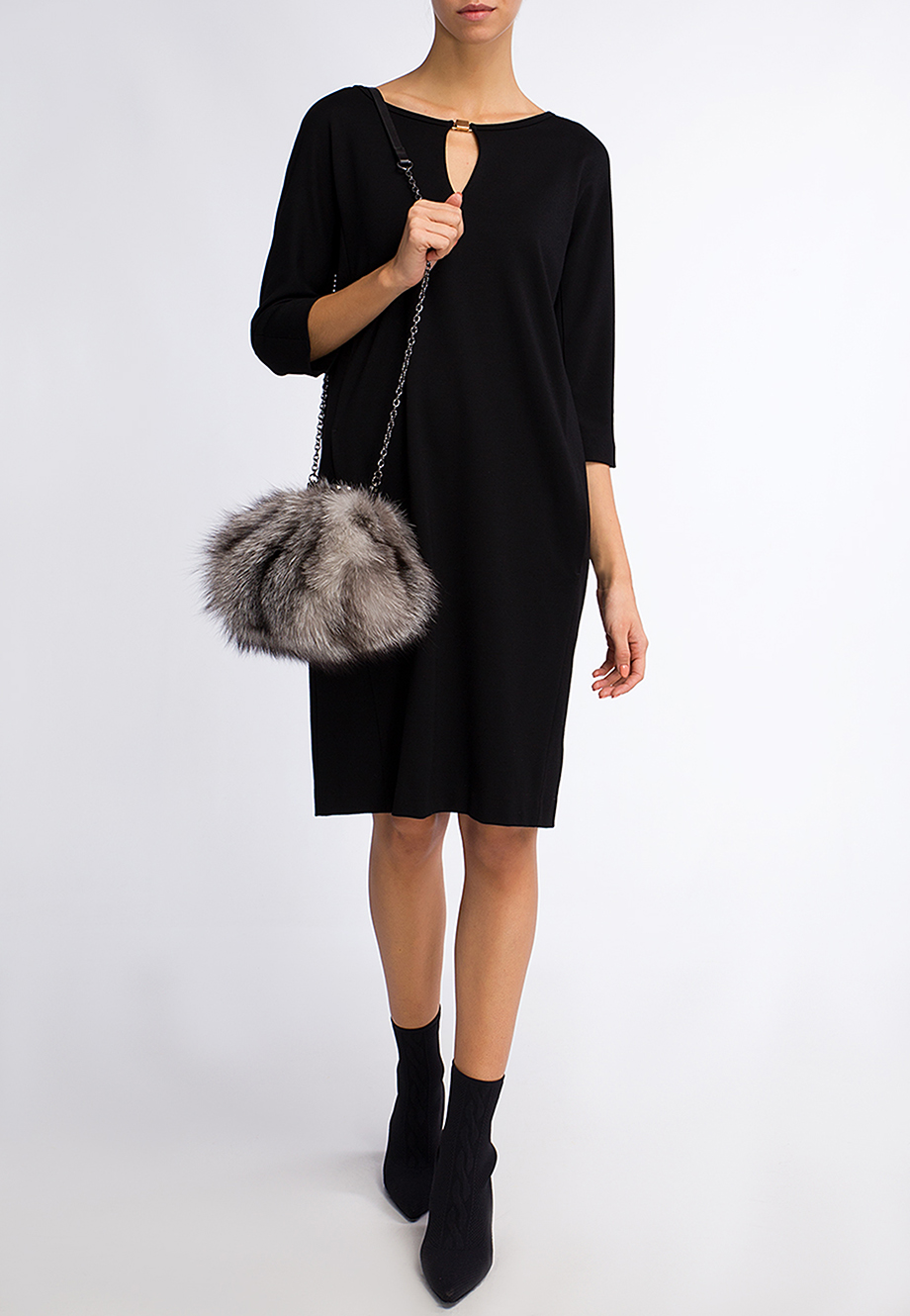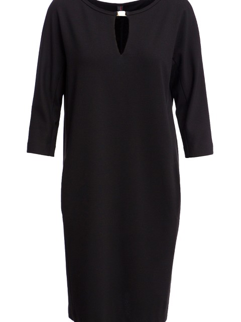 Детали: овальный крой, вырез горловины лодочкой и мысом и металлической пряжкой, цельнокроеный рукав длиной ¾, прорезные карманы по боковым швам, длина до колена.