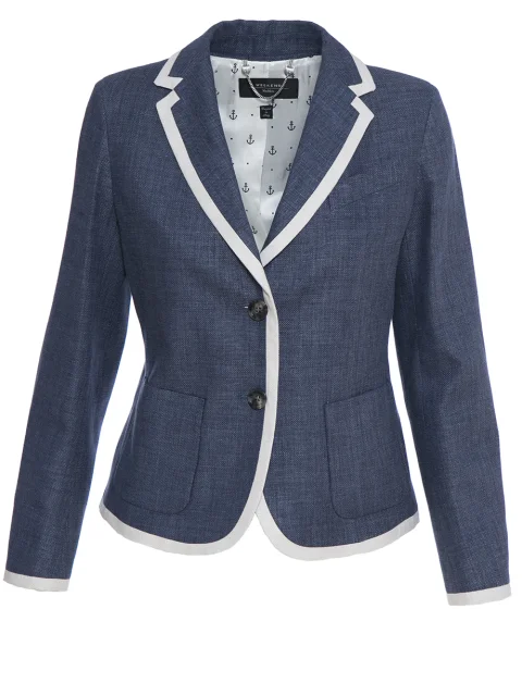 Детали: традиционный крой, отложной воротник с лацканами. Широкий контрастный кант по краю, два накладных кармана по бокам и один нагрудный. Шлица на спинке по центру.