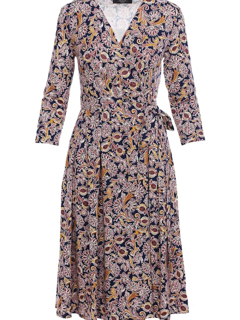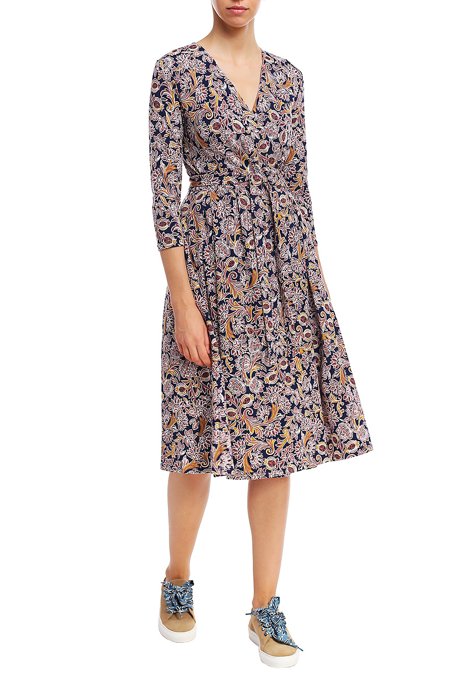 А-силуэт, крой на запах, V-образная линия декольте, длинный втачной рукав, цветочный паттерн, юбка со сборкой, длина до колена.