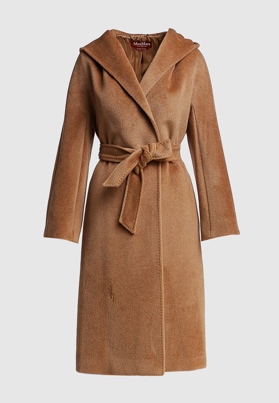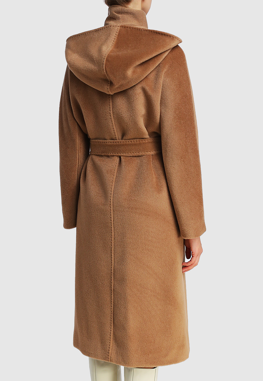 Прямой крой под пояс, отложной воротник с капюшоном, цельнокроеный длинный рукав, прорезные карманы по боковым швам, отделка ручным стежком по кромке, пояс.