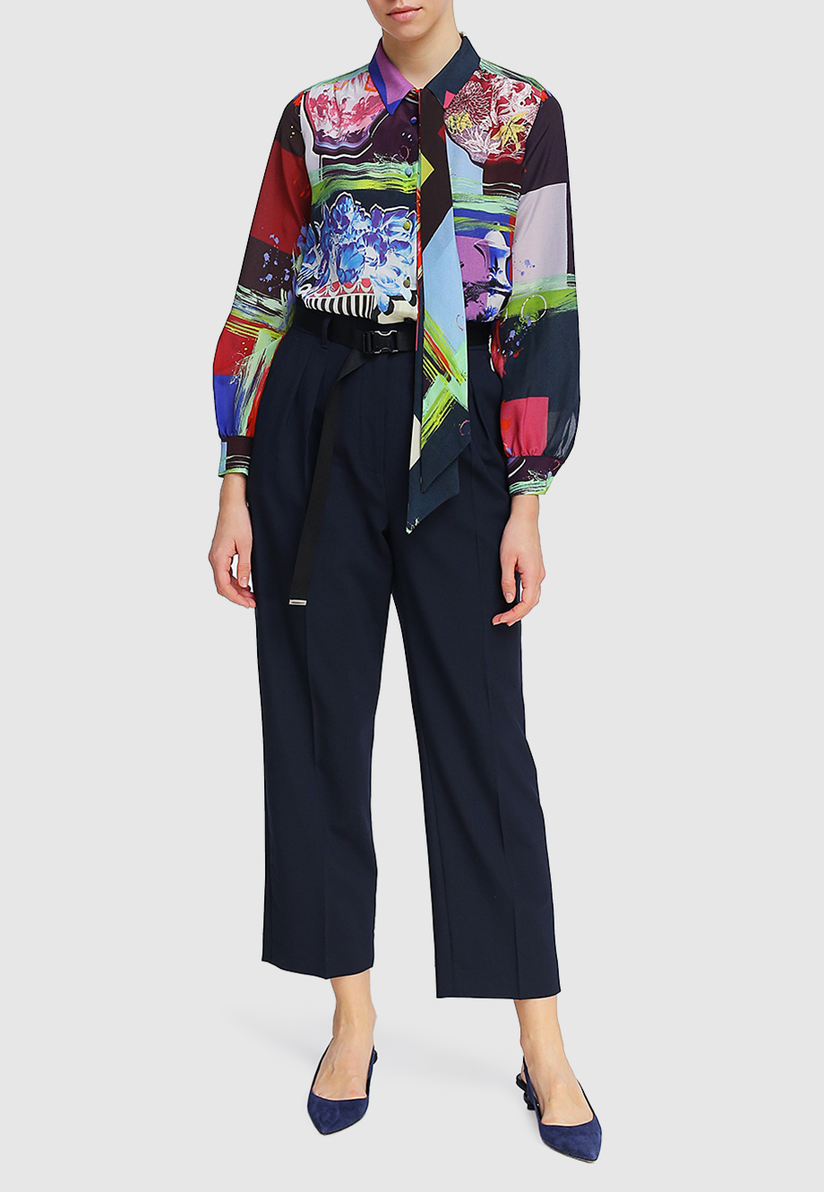 Прямой свободный крой, отложной ворот с гатсучной лентой, длинный втачной рукав с манжетой на пуговице, планка с рядом пуговиц цветной абстрактный принт.
